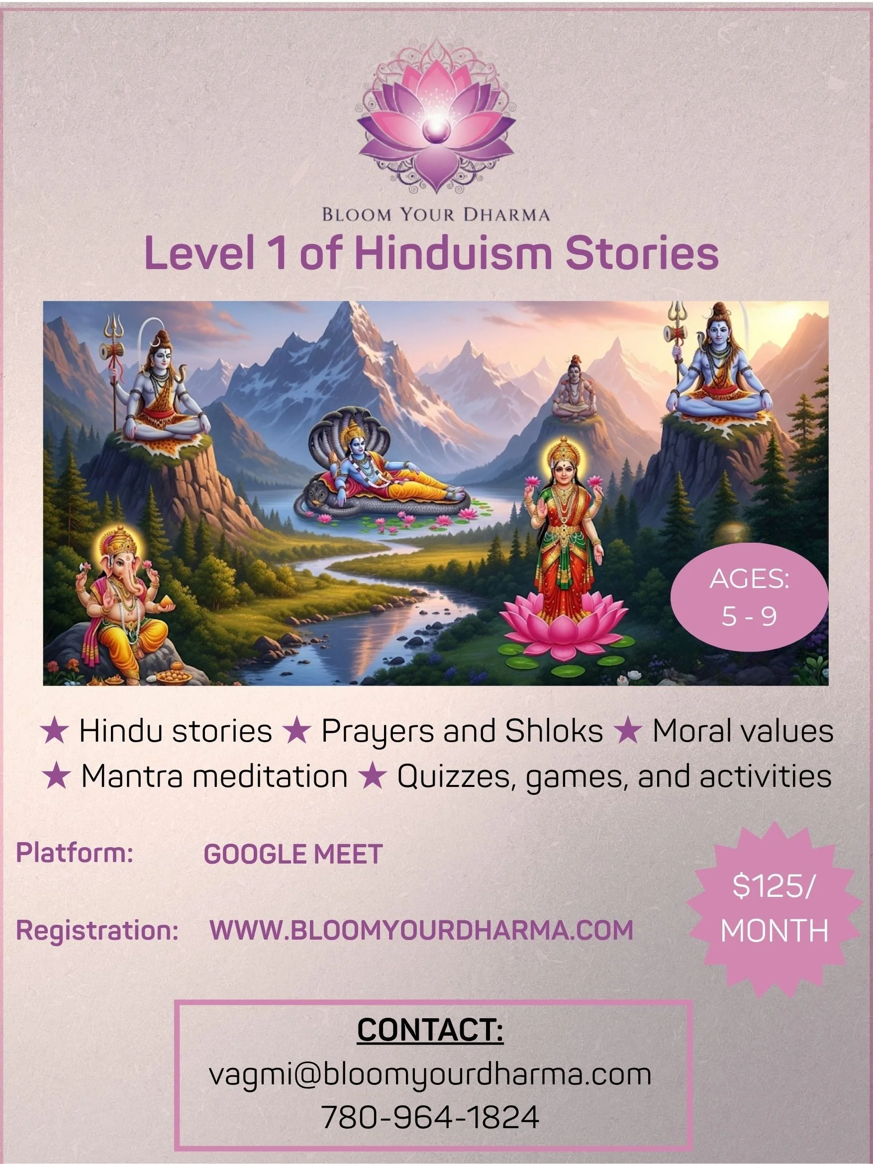 Bloom Your Dharma invites children ages 5+ on a transformative continuous journey through the sacred stories and profound symbolism of Hindu deities. From Ganesha's wisdom to Durga's courage, from Shiva's transformation to Hanuman's devotion — these course brings these divine beings to life in ways that are meaningful, inspiring, and deeply personal.